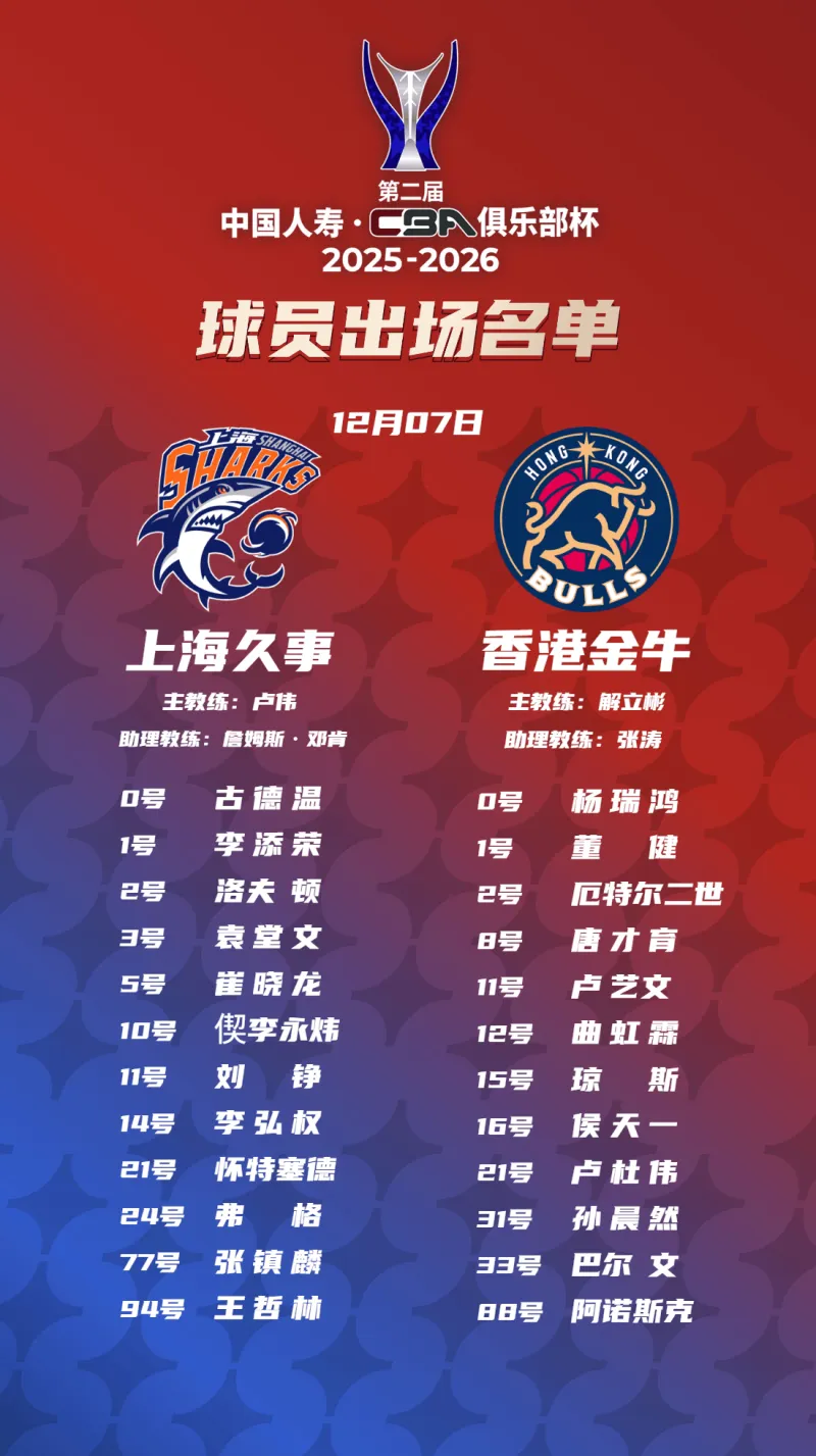 虎撲12月07日訊 今日CBA杯,上海男籃將對陣香港金牛。板C杯上