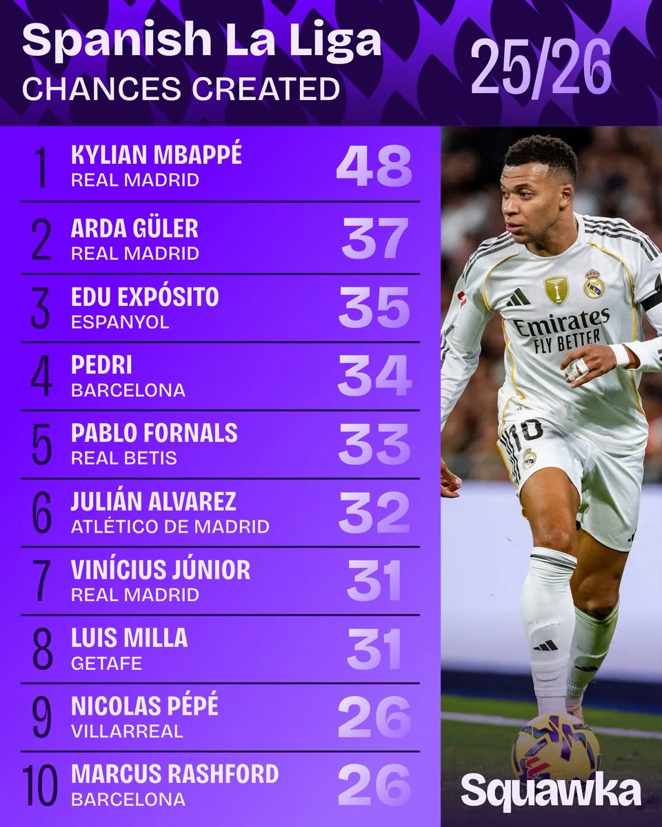 虎撲12月16日訊 Squawka統(tǒng)計(jì)了本賽季西甲聯(lián)賽創(chuàng)造機(jī)會(huì)最多的球員: